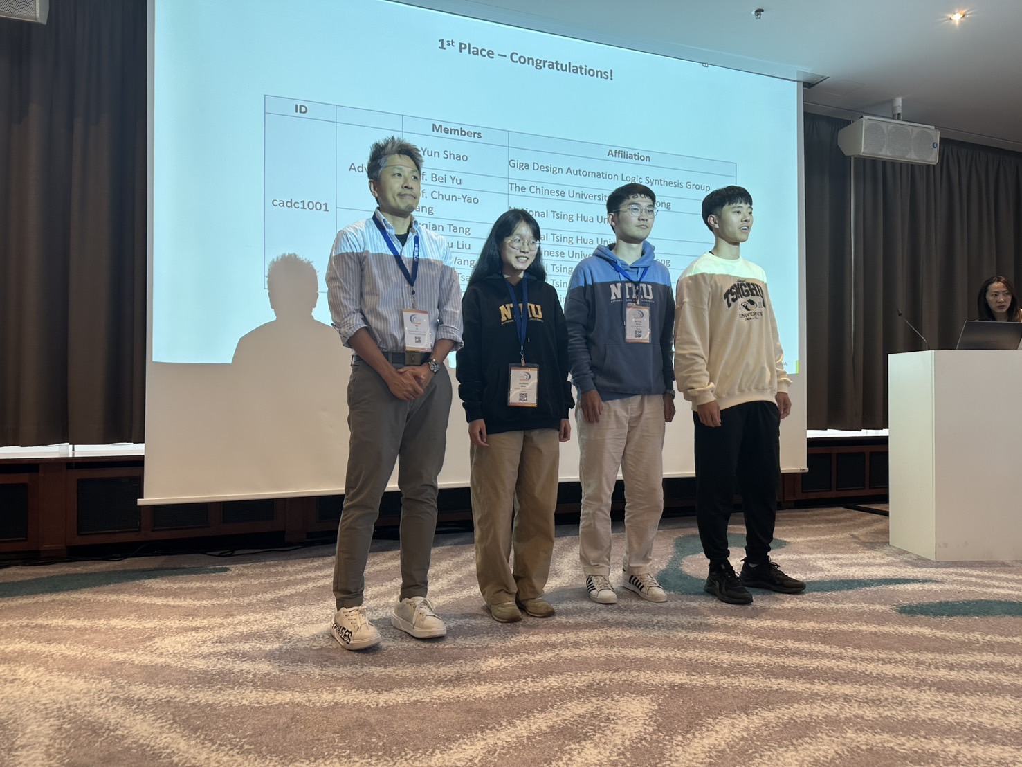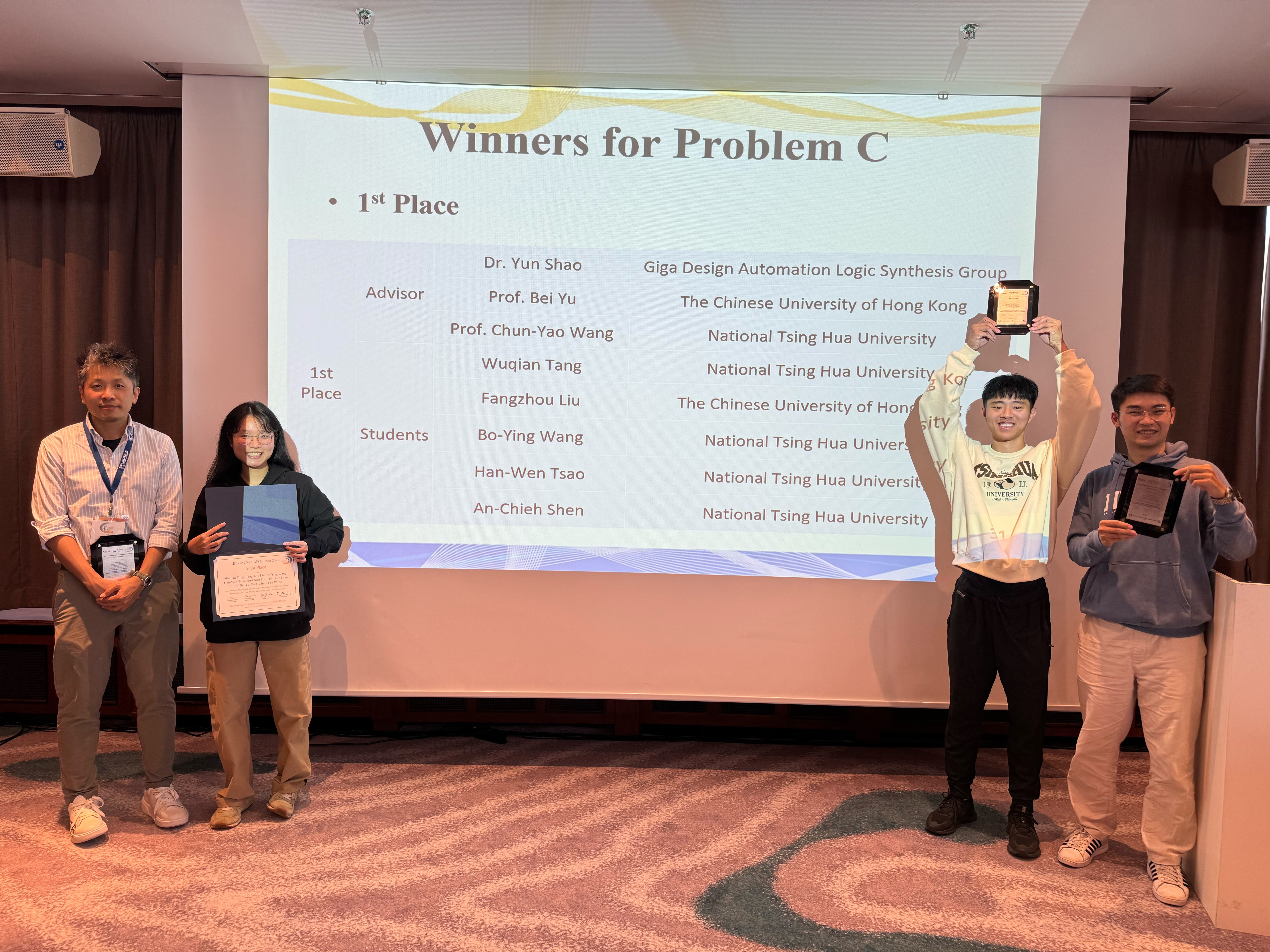 A cross-institutional research team supervised by Professor Bei Yu from Department of Computer Science and Engineering at The Chinese University of Hong Kong (CUHK), in collaboration with National Tsing Hua University (NTHU) and Giga Design Automation Co., Ltd., has won First Place in Problem C at the 2025 ICCAD CAD Contest—one of the world’s most prestigious competitions in Electronic Design Automation (EDA). The team was officially recognized for this outstanding victory during the International Conference on Computer-Aided Design (ICCAD 2025), which successfully concluded on October 30, 2025, in Munich, Germany. Under the supervision of Dr. Yun Shao, Professor Bei Yu, and Professor Chun-Yao Wang, the team achieved the global championship, ranking #1 among nearly 50 teams worldwide. They competed in Problem C, titled “Incremental Placement Optimization Beyond Detailed Placement: Simultaneous Gate Sizing, Buffering, and Cell Relocation.” Designed by NVIDIA, this topic addressed critical challenges in integrated circuit physical design, tasking contestants with balancing timing, power, and area through a coordinated approach integrating placement optimization, gate sizing, and buffering techniques. The contest featured a rigorous three-stage evaluation process—Alpha, Beta, and Final tests—where teams were ranked based on the performance of their source code. The joint team’s solution demonstrated exceptional engineering quality and efficient runtime performance across all phases. By implementing novel techniques that fused GPU-based multi-objective optimization with evolutionary algorithms, they secured the First Prize of NT$70,000. This remarkable achievement highlights the strong collaboration between CUHK and NTHU, showcasing the team’s technical excellence, cutting-edge research, and growing global influence in the EDA community.